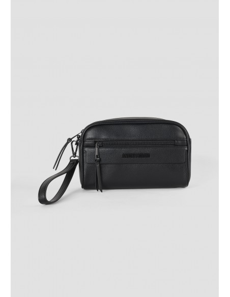 A solid-color faux leather clutch bag. This accessory features an embossed metal logo on the front, a removable pouch with a hook, and a zip pocket on the front. A versatile and practical solution to always have with you.