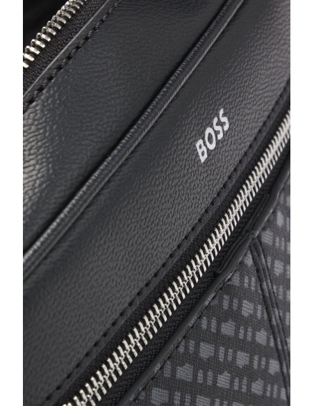 A distinctive BOSS wash bag with a monogram print on the front pocket. This accessory features a logo trim and is made from coated synthetic fabric. Coated synthetic fabric, sometimes referred to as faux leather, is a fabric designed to resemble real leather and/or display a matte, shiny, smooth or textured finish.