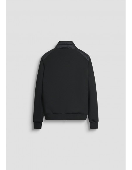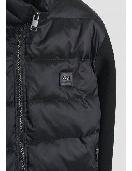 This slim-fit down jacket is made from a shiny nylon fabric. This fabric gives the garment durability and versatility, both aesthetically and functionally. The contrasting sleeves, made of stretch scuba fabric, are a distinctive feature. The jacket also boasts soft and lightweight DuPont Sorona® eco-friendly fill, renowned for its high-performance elasticity, shape retention, and, above all, its superior thermal comfort. It features a double-slider front zip closure and two zipped front pockets with welts. A logo patch is applied to the front. This style is ideal for those seeking a garment to face the first chilly days of the season.