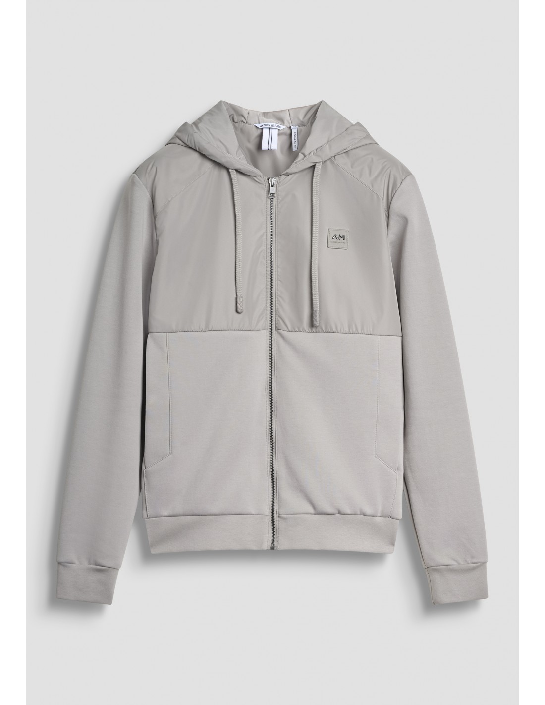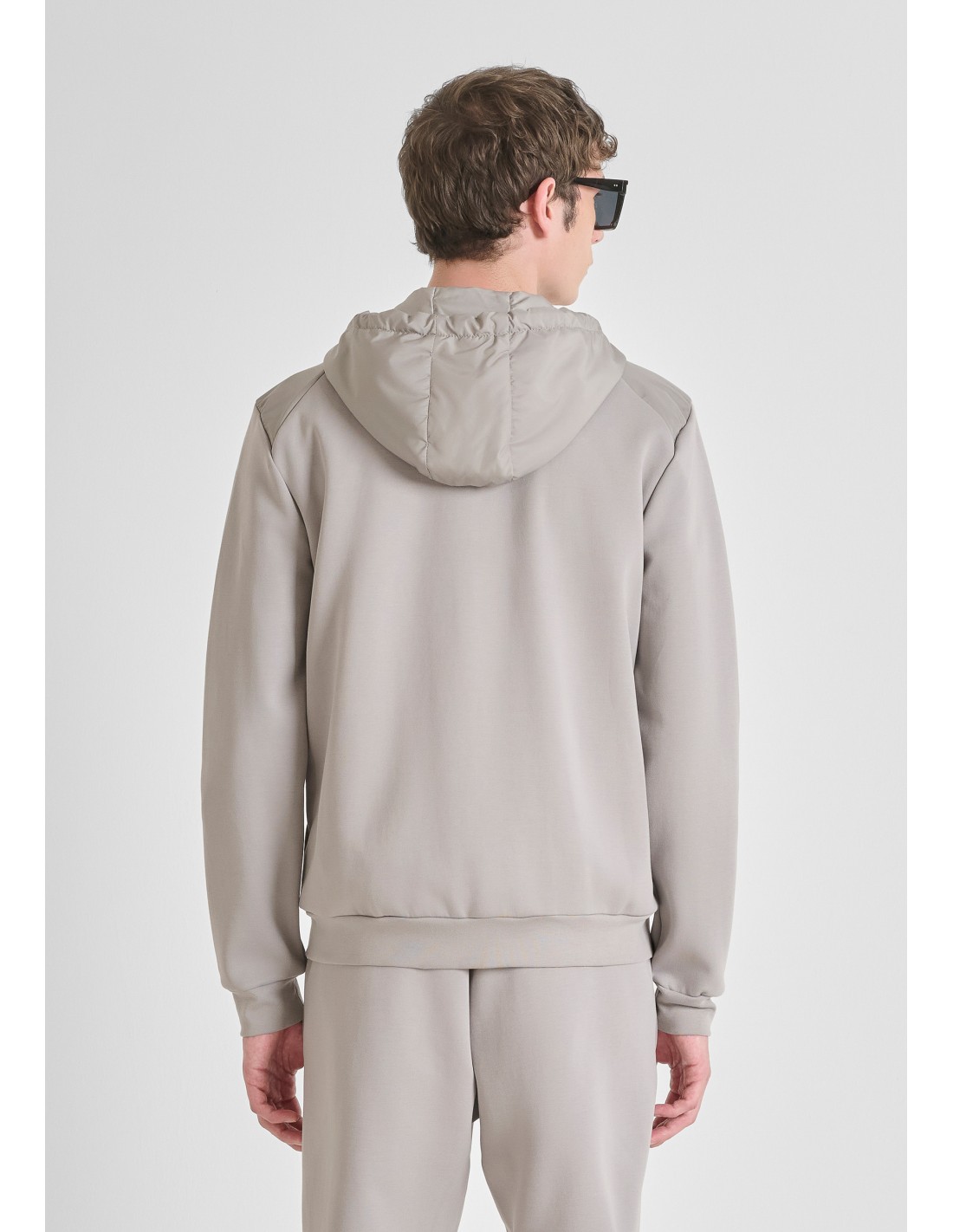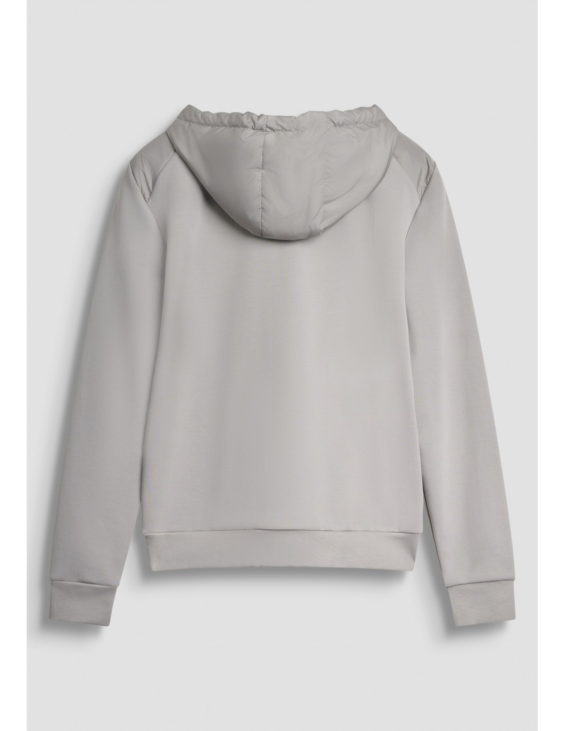 Regular fit hoodie with a central zip closure and hood. Made from a compact and comfortable cotton interlock blend fabric with contrasting technical fabric inserts. Ribbed cuffs and hem. The hoodie also features lightweight DuPont Sorona® eco-friendly insulation, renowned for its high-performance elasticity, shape retention, and, above all, its superior thermal comfort. The hood has adjustable drawstrings. A logo patch is applied to the chest. A sporty chic garment ideal for those seeking comfort without sacrificing style.