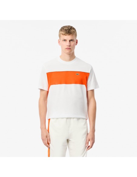 Lacoste's basic T-shirt, crafted from heavyweight cotton jersey for comfort, gets a bold, cut-and-stitch colour-block design. The signature crocodile, rendered in intricate embroidery, adds a stylish touch.