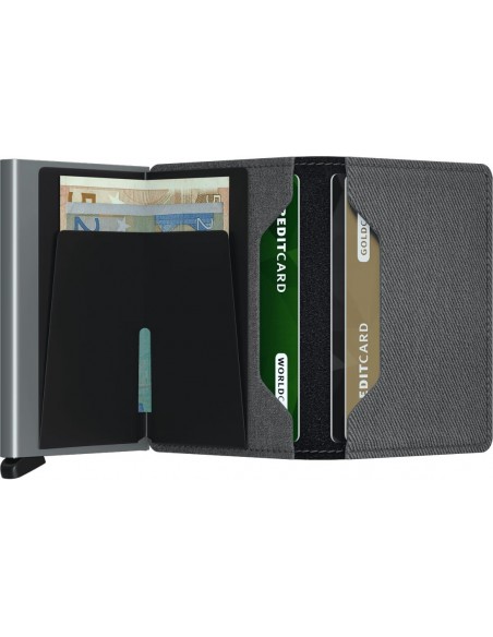 Small in size but surprisingly large in capacity, the Miniwallet meets all needs. The outer cover can contain bills, tickets and cards, while the aluminum Cardprotector allows cards to be removed with a simple movement, preventing them from being bent, broken or read without us noticing.