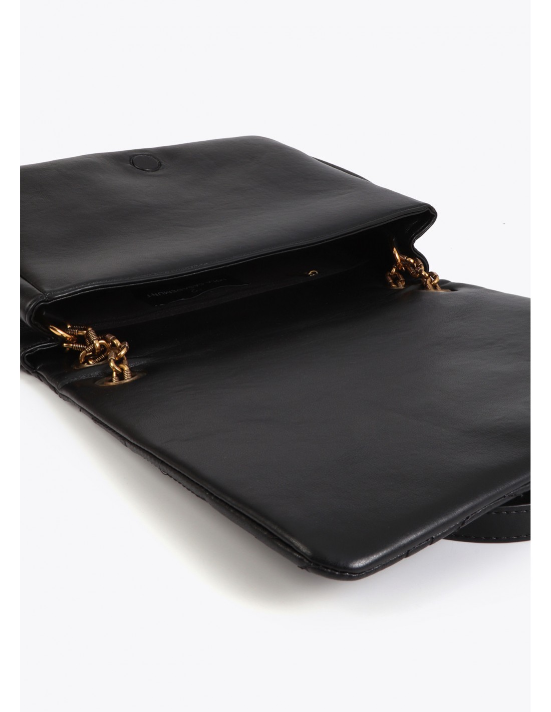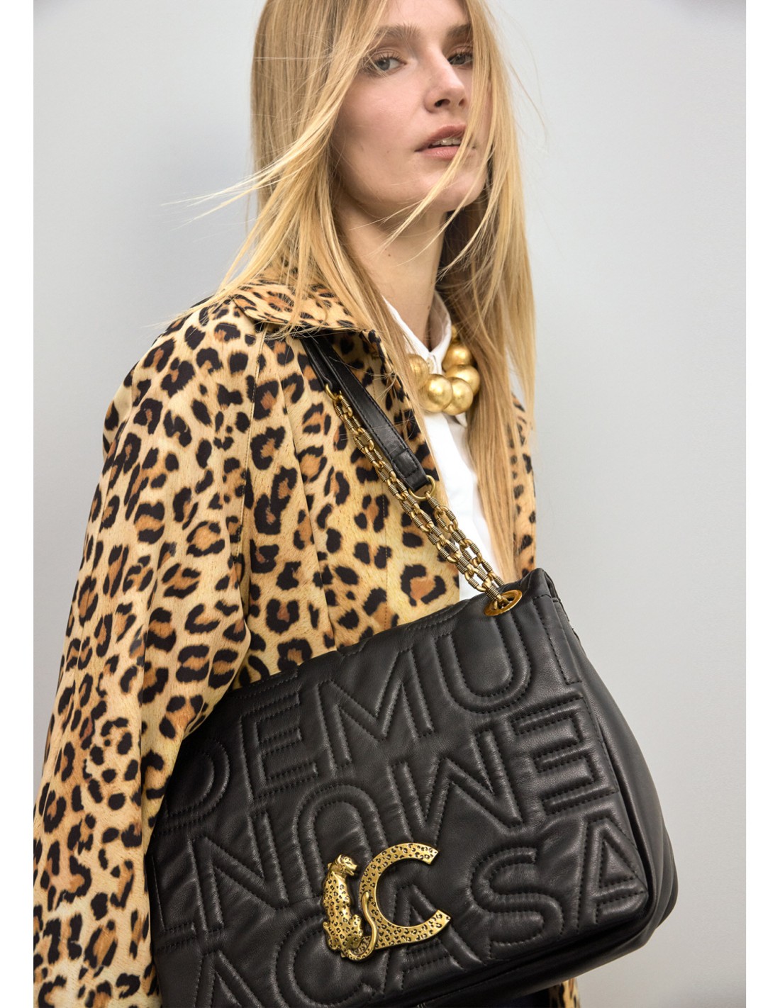 Elegant crossbody bag with a stitched logo on the flap. Made from high-quality material, it features a spacious design and gold-tone chains for added sophistication. Ideal for complementing your everyday looks.