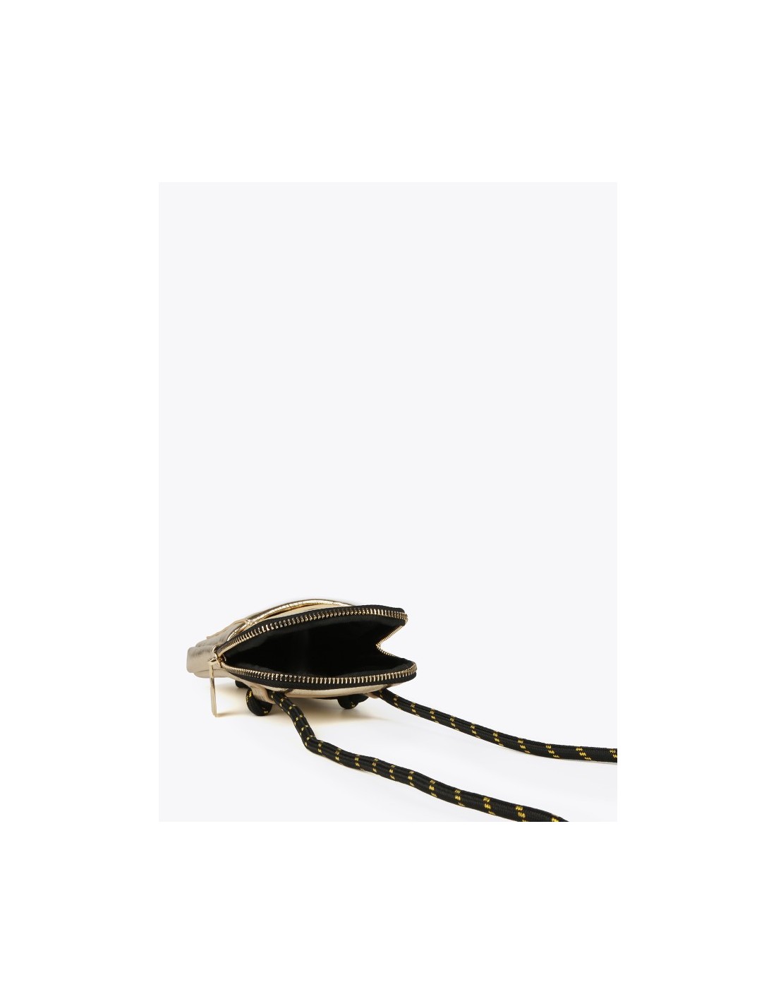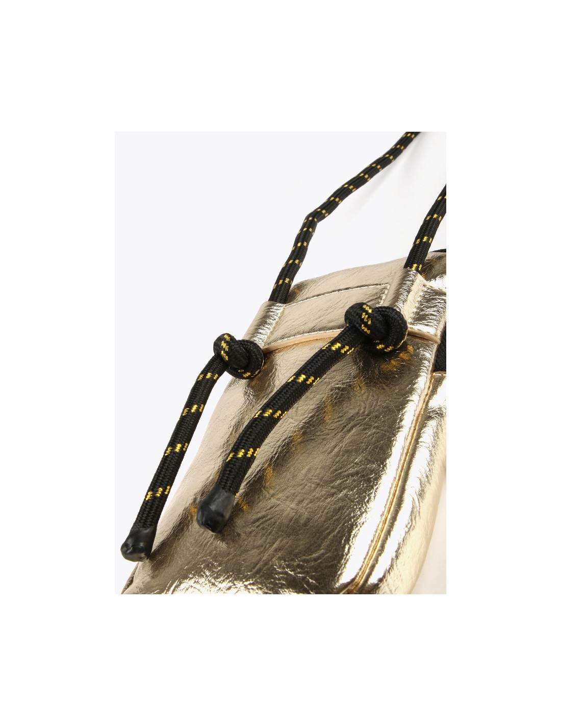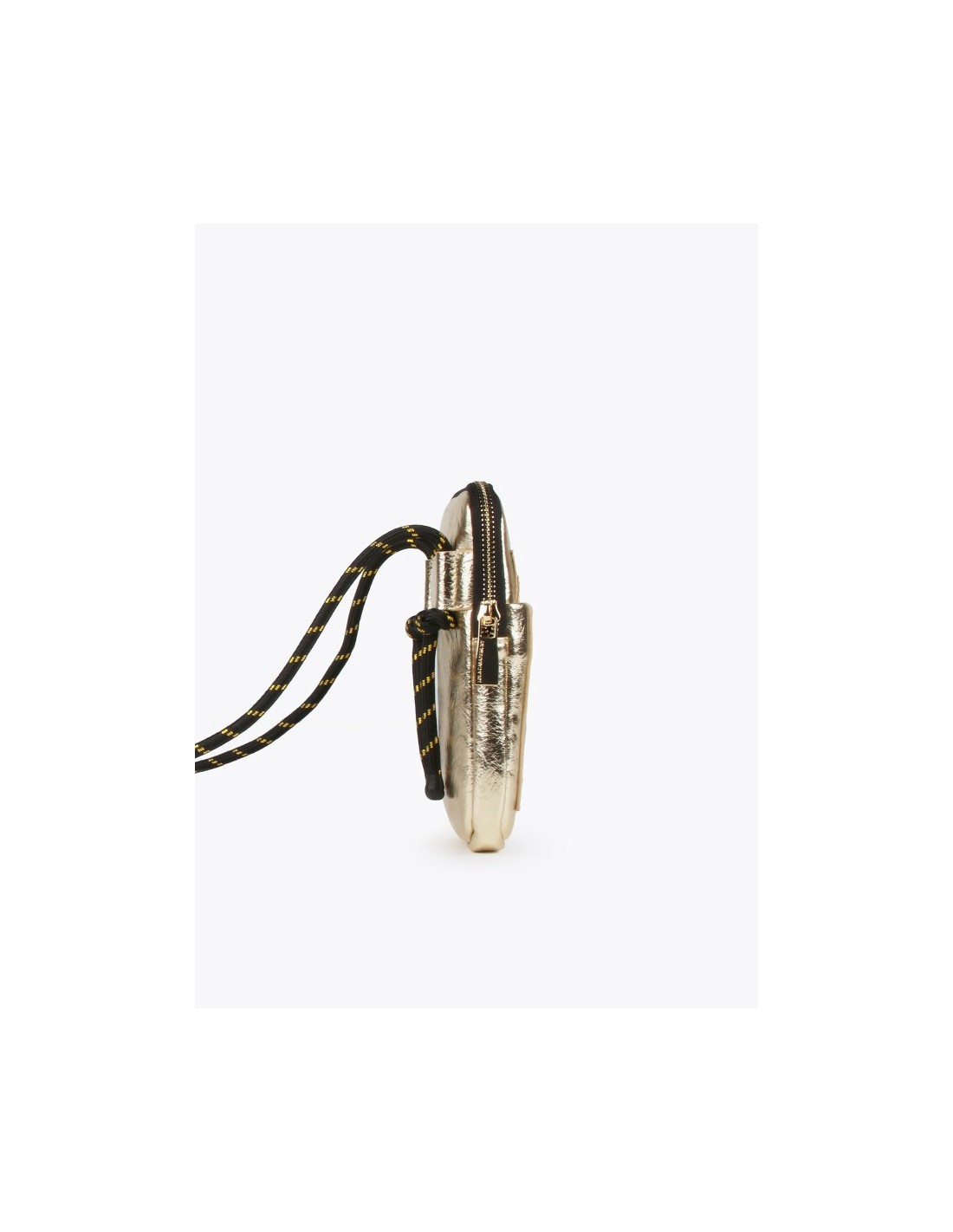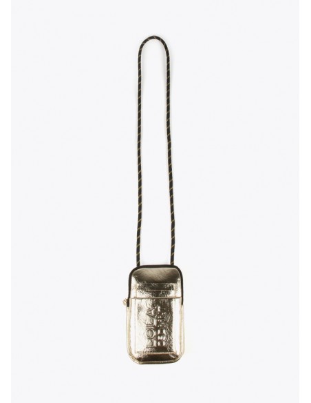 Metallic phone bag with embossed logo and zip closure. Adjustable drawstring shoulder strap.