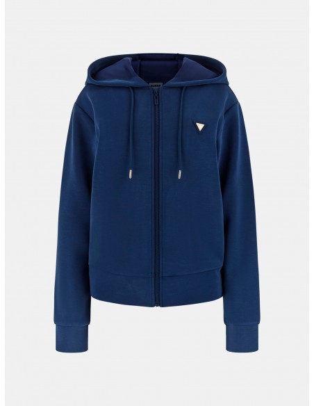 Experience elegance and comfort in this modal hoodie. Designed with a regular fit, long sleeves, and a crew neck. It features a zip closure and adjustable drawstring for a stylish look. Perfect for a relaxed day. Made from scuba fabric with a modern logo patch.