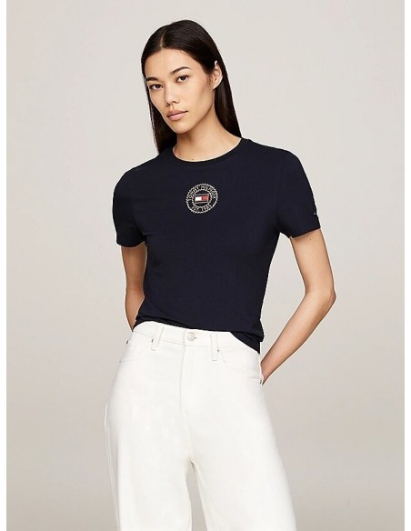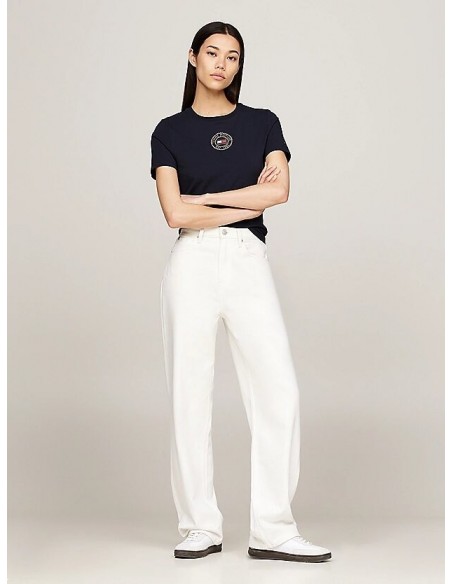 Upgrade your casualwear edit with this flattering slim fit T-shirt, which is crafted from stretch cotton and features a Tommy Hilfiger signature on the front.