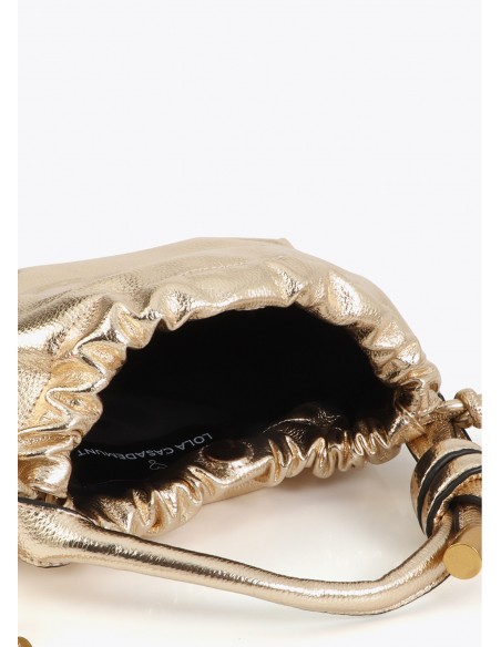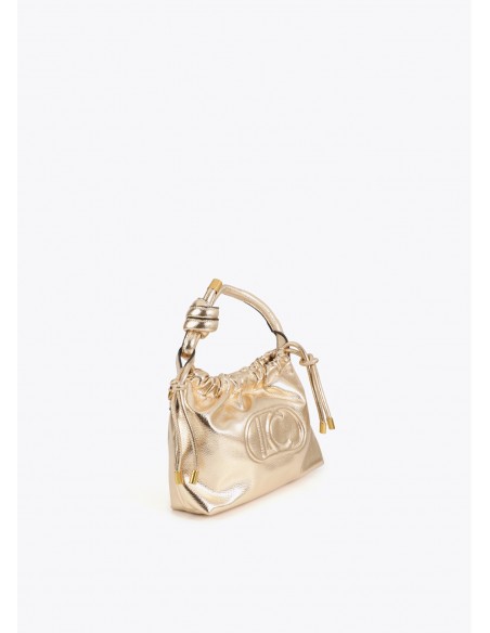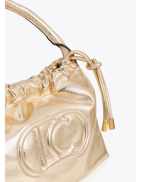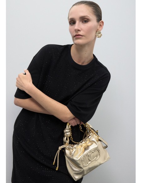 Elegante bombonera dorada con logo ovalado en relieve. Cierre con cordón ajustable y cadena dorada para llevar al hombro. Perfecta para complementar tus looks más sofisticados. Forro interior suave y detalles de alta calidad.