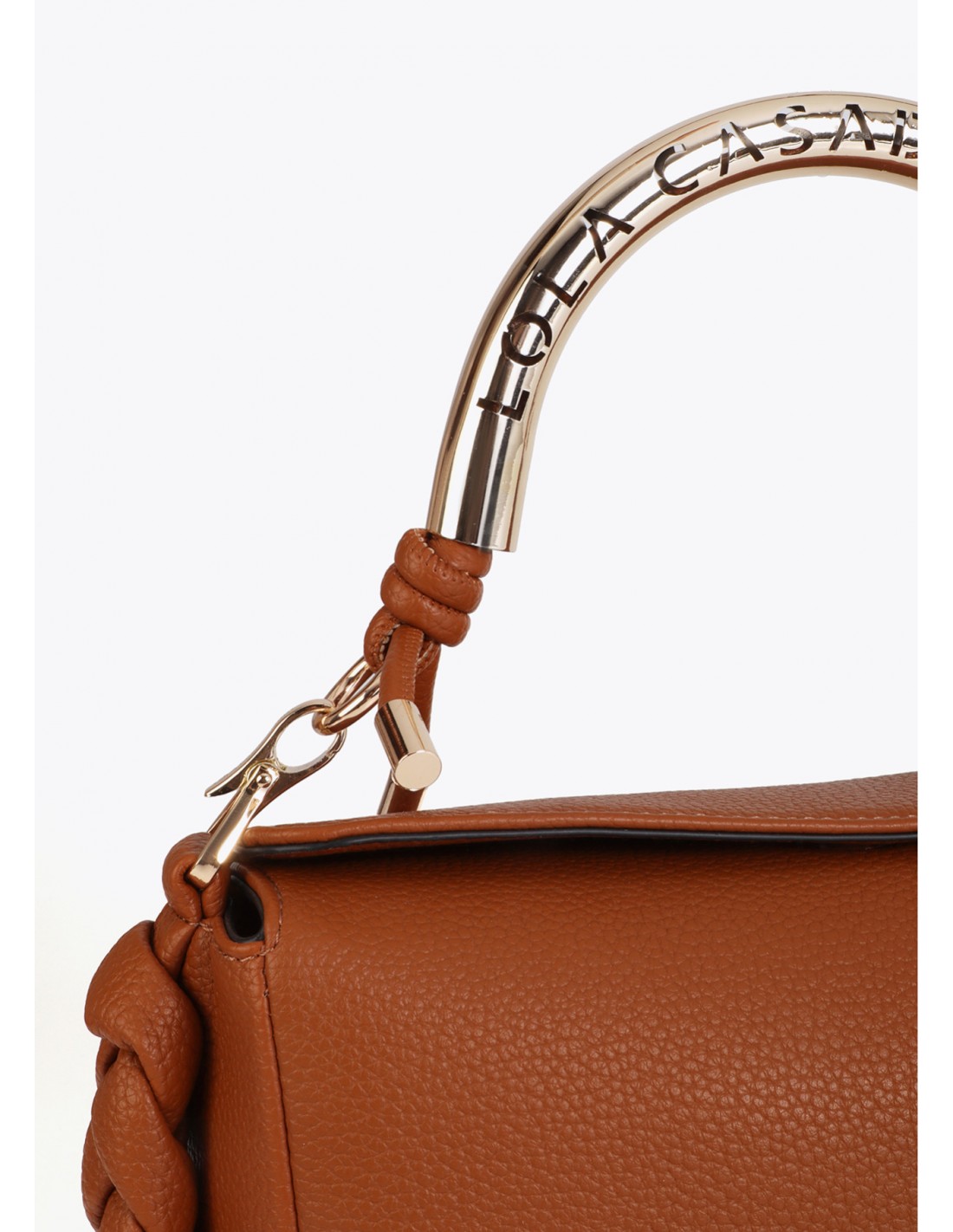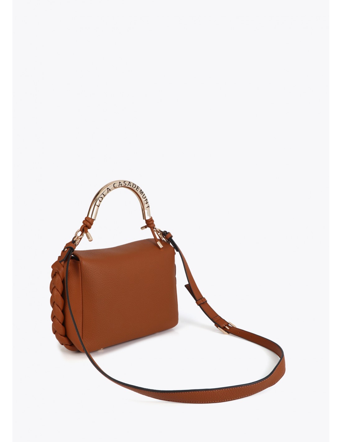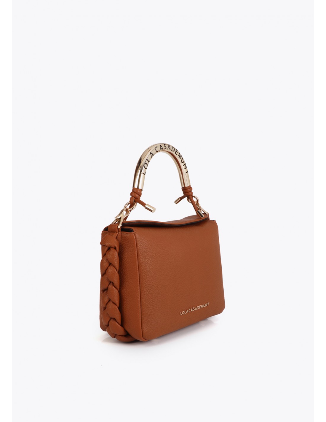 Bolso bandolera de diseño elegante en color marrón, elaborado con piel sintética de alta calidad. Asa metálica troquelada y detalle de trenzado lateral. Cierre magnético y correa ajustable desmontable para mayor comodidad.