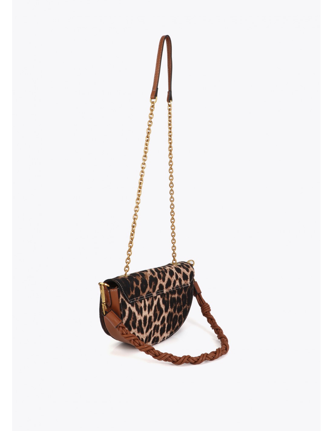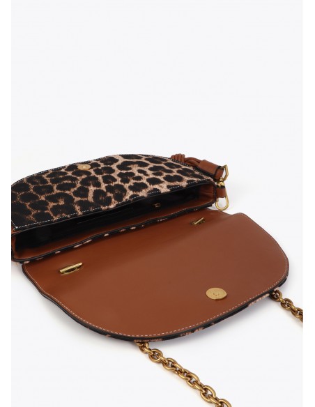 Bolso media luna con estampado de leopardo y efecto piel. Asa de cadena dorada y correa trenzada en cuero sintético. Cierre magnético y espacioso compartimento interior. Un complemento audaz y estiloso para tu día a día.