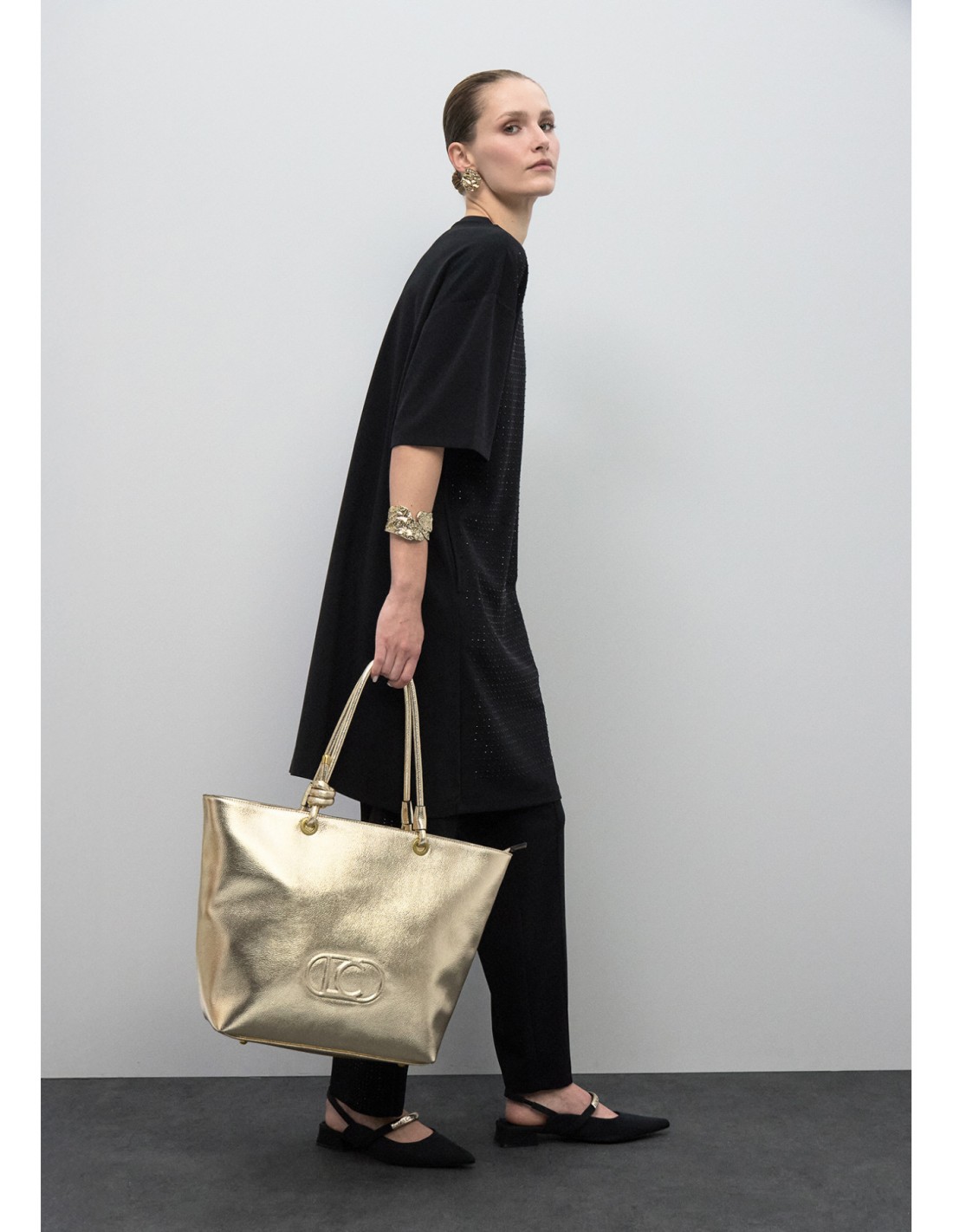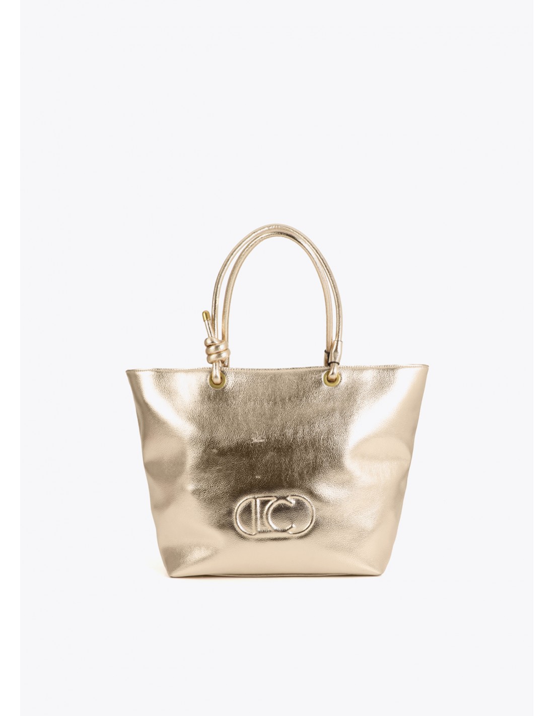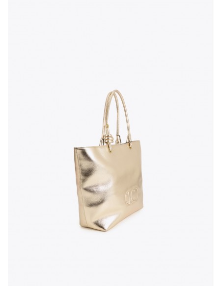 Shopper desestructurado en acabado dorado brillante con logo ovalado en relieve. Asas dobles entrelazadas y cierre de cremallera superior. Amplio interior con bolsillo lateral para organización. Perfecto para añadir un toque glamuroso a cualquier atuendo.
