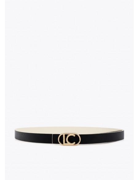 Cinturón reversible de diseño elegante con hebilla en forma de logo ovalado dorado. Fabricado en material sintético de alta calidad, permite dos combinaciones de color: negro y blanco. Un complemento versátil y chic para cualquier atuendo.