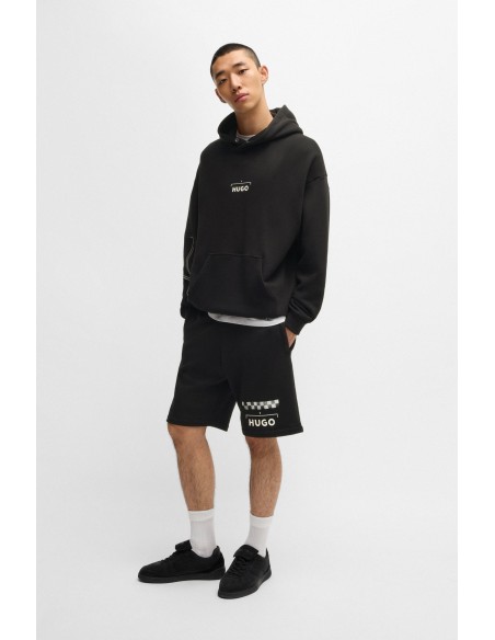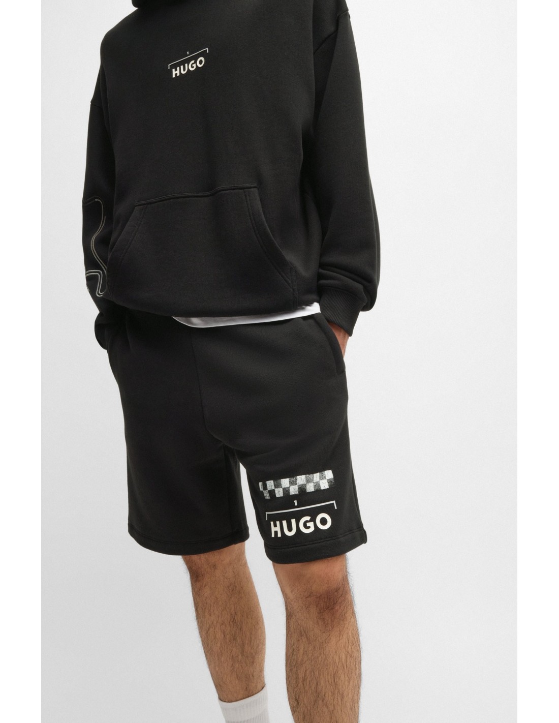 Estos shorts HUGO Hombre de estilo desenfadado están adornados con un logo y un estampado de carreras en la pernera izquierda. Esta prenda relaxed fit está elaborada con felpa de rizo rica en algodón.