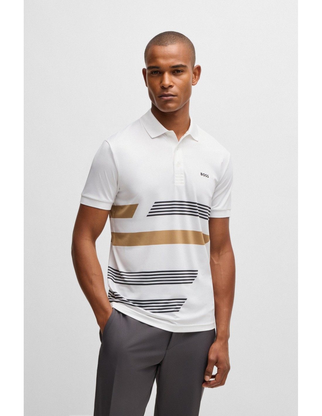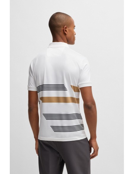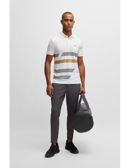 Un dinámico polo BOSS Hombre con detalle de la marca y rayas estampadas. Esta prenda regular fit se ha confeccionado en punto multielástico para resultar más cómodo.
