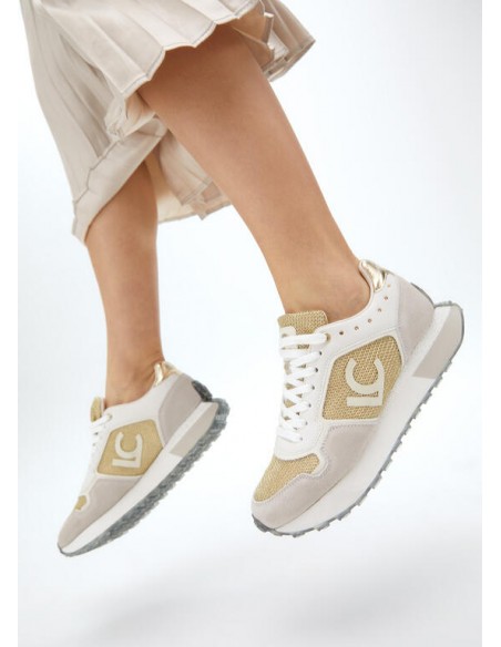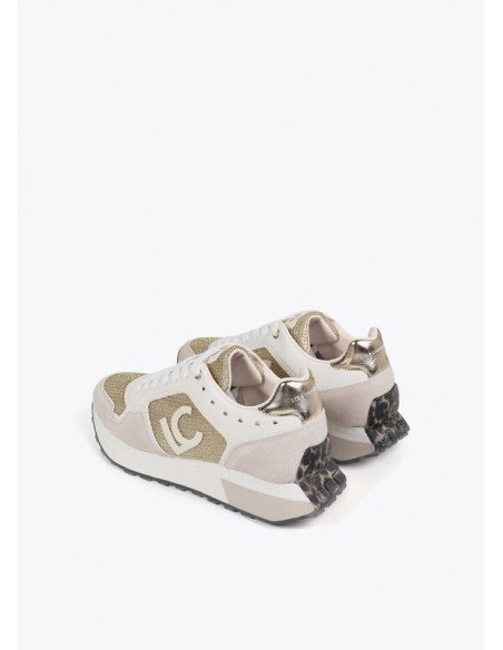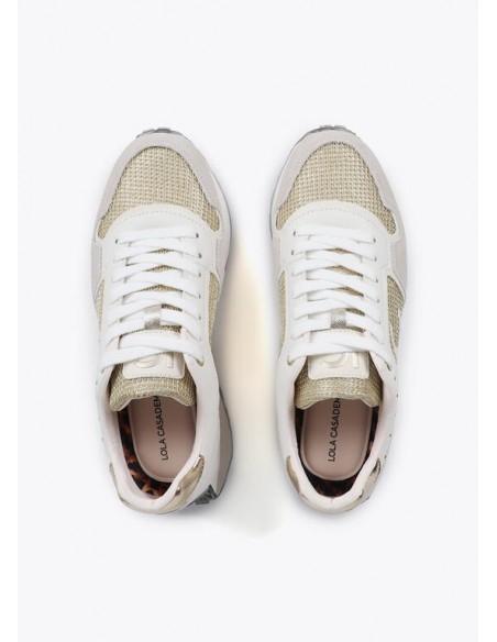Zapatillas deportivas con diseño único con detalles dorados. Suela personalizada para máximo confort. Elegante combinación de materiales premium, incluyendo inserciones metálicas. Cierre de cordones y refuerzo en talón.